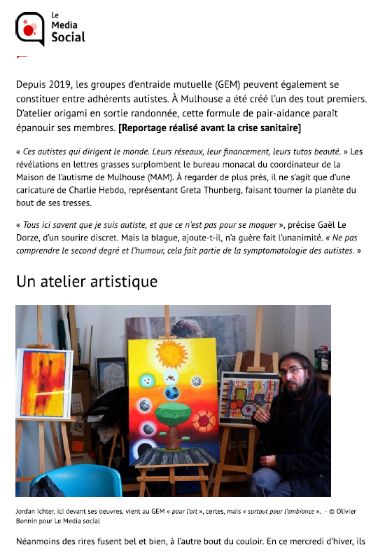 La chaîne locale Alsace 20 a publié un reportage sur la Maison de l’Autisme de Mulhouse. Tourné durant un atelier artistique avec Bernard Latuner, ce reportage contient deux témoignage d’adhérent et une interview du coordinateur.